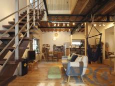 霧骨な鉄骨梁とオープン階段が、なんとも喫茶店のような雰囲気を醸し出せているとは思いませんか?また、天井の梁もリノベーション前の住宅のものをそのまま使用していまして、OSBの天井と相まって独特な雰囲気を演出しています。これは新築にはマネ出来ない味ですね!